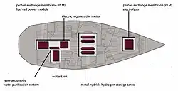 - Hydrogen storage, either metal hydride or lightweight composite pressurized tanks