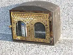A yahrzeit candle on a grave, in a box to protect it from the wind