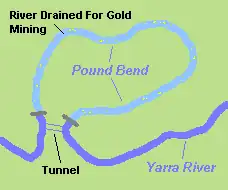 Gold was first discovered in Victoria near the Yarra River in Warrandyte. The find was made by Louis Michel in 1851 at a tributary of the river, Andersons Creek and marked the start of the Victorian gold rush. The approximate location of the site is marked by a cairn on Fourth Hill in the Warrandyte State Park. The river was drained and diverted in various areas throughout the gold rush to aid gold miners. An example of this is the tunnel at Pound Bend in Warrandyte. The river was partially dammed at Pound Bend near Normans Reserve at its eastern entrance and near Bob's wetlands at its western exit. Miners then blasted a 145m long tunnel through solid rock. The river was then fully dammed at the entrance and exit to the tunnel and water was diverted through 145m and out the other side leaving a 3.85 km of riverbed around Pound Bend exposed to the sun and the miners picks. Other diversions include The Island cutting in Warrandyte and the Little Peninsula Tunnel and Big Peninsula Tunnel near McMahons Creek.