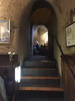 Ye Olde Trip to Jerusalem is a Grade II listed[1] public house in Nottingham which claims to have been established in 1189,[2] although there is no documentation to verify this date. The building rests against Castle Rock, upon which Nottingham Castle is built, and is attached to several caves, carved out of the soft sandstone.[3] These were reputedly originally used as a brewhouse for the castle, dating from the medieval period.