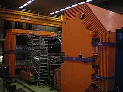 The German national laboratory DESY was founded in 1959 and started operating its first particle accelerator in 1964. Since then, it has been a highly regarded center for particle physics, photon science, astroparticle physics, and the development, construction and operation of particle accelerators. The design effort for ZEUS can be traced back to 1982.[4] A Letter of Intent was submitted in 1985.[5] The ZEUS detector was operational with the first collisions of the HERA collider in 1992. The last electron–proton collisions at ZEUS were recorded on 30 June 2007.[6] The other multi-purpose experiment at the HERA collider was the competing H1 experiment. Since May 2012, the former ZEUS detector hall has been used as a lab space for the international European XFEL project.[7]