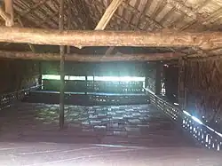 Zawlbûk was always located at the centre of the village, in close proximity to the chief’s residence. Since its basic purpose was to house all the bachelors of the village, it was dominantly the largest house. The size did vary from village to village depending on the size of the community. It was constructed through social work using timbers and thatch from the nearby forest.[5] The timber forming the central pole is especially large to support most of the structure and is called tlung. From this were extended a sloping roof and floor with support structures. The floor and walls were made of cracked bamboo, and the roof was made entirely of thatch. It had no special entrance as the entire front was open. However, the front had a small platform or verandah with a bamboo wall hanging from the roof up to about 5 ft, making the entrance quite low. Usually to the right of this area was reserved for the stockpile of firewood.[6] The space around this verandah was called awkpaka, which was delimited by one (or two) massive log of wood, at about 2 ft high, spanning the whole breadth of the entrance. This was known as bawhbel (or pawmpual to the southerners) and was an off-limit to the rest of the population, women, children, married men, and even the royalty and the council. The interior was simply a spacious empty room practically without any furniture, other than a fireplace at the very centre. The back wall was made into a small platform known as dawvan about 6 ft wide and 1 ft high from the floor. The entire floor served as a wrestling (which was predominantly the nightly activity) arena and the sleeping area, and is called buanzawl. Just above was the bahzar which could be opened towards the outside as a big window.[7]