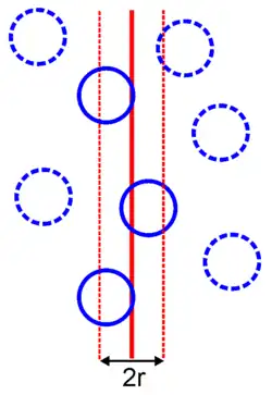 Only particles within one radius (solid circles) can intersect a planar boundary