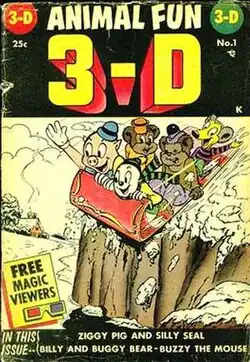 Silly Tunes #7 (April 1947) marked their final Golden Age appearance. After this era, they reappeared in the one-shot 3-D comic book, Animal Fun 3-D (Dec. 1953), from Premier Magazines.[10] Ziggy and Silly also appeared in issues of the unauthorized reprint titles Billy And Buggy Bear, Wacky Duck, Super Rabbit, and Ziggy Pig from Israel Waldman's I. W. Publications / Super Comics, for a short time beginning in 1958.