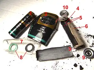 Early types, and low-cost cells, use a separator consisting of a layer of starch or flour. A layer of starch-coated paper is used in modern cells, which is thinner and allows more manganese dioxide to be used. Originally cells were sealed with a layer of asphalt to prevent drying out of the electrolyte; more recently, a thermoplastic washer seal is used to help prevent leakage as well as to contain any internal pressure which may form as a result of hydrogen gas buildup during discharge. The carbon rod is slightly porous, which allows more charged hydrogen atoms to combine forming hydrogen gas.[5] The ratio of manganese dioxide and carbon powder in the cathode paste affects the characteristics of the cell: more carbon powder lowers internal resistance, while more manganese dioxide improves storage capacity.[7]