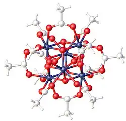 The species Zr6O4(OH)4(CH3CO2)12 is a common precursor to metal-organic frameworks (MOFs).[3] The structure of the 8.5 hydrate (Zr6O4(OH)4(CH3CO2)12·8.5H2O) has been determined by EXAFS. The core can be described as a Zr6 octahedron is face-capped with oxide and hydroxide ligands.[2]