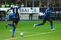 Ibrahimović started his third Inter season by winning the Supercoppa Italiana against Roma. After the regular and extra time had finished in a draw, the match went to a penalty shootout where he successfully converted his penalty attempt.[44] He scored his team's only goal in the 2008–09 Serie A opening match against Sampdoria, which finished in a 1–1 draw.[45] On 4 October, during the match against Bologna at home which Inter won 2–1, Ibrahimović scored a sensational goal, stunning Francesco Antonioli with an irresistible backheeled shot from Adriano's left-wing cross. The goal was later voted Goal of the Year in Serie A.[46] On 19 October 2008, Ibrahimović continued with his solid performances by scoring twice in an impressive 4–0 win at Roma, taking his tally up to five league goals.[47] He then scored another double in the Matchday 12 win against Palermo to help Inter take the lead in the Serie A table by one point.[48] In the next fixture, Ibrahimović provided the assist on the only goal in the Derby d'Italia match against Juventus at home, helping Inter to extend their league lead.[49]