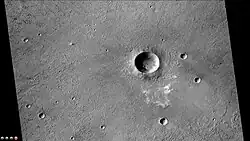 These pits may result from the interactions of hot crater-fill deposits with water and water-ice that may have been present in the subsurface prior to impact. It is not well understood whether these pits form explosively (similar to terrestrial volcanic pits/craters formed from the interaction of hot lava with wet sediments/deposits), or by collapse from the drainage of impact melts or volatiles. Since the pitted deposits occur only in the freshest and well-preserved craters suggests that they are likely related to the impact process.[2][3][4]