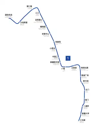Line 1 runs from Ürümqi Tianshan International Airport through downtown Ürümqi and ends at Santunbei station. It has a total length of 27.615 km[5] and 21 stations.[5][6] It is fully underground.[7]